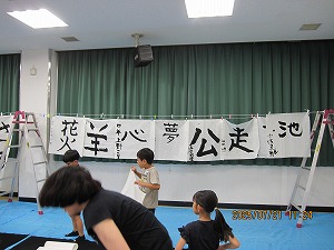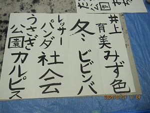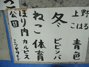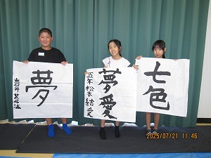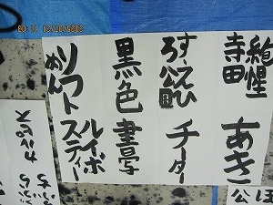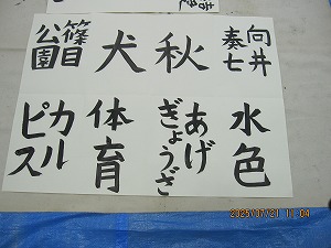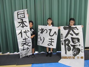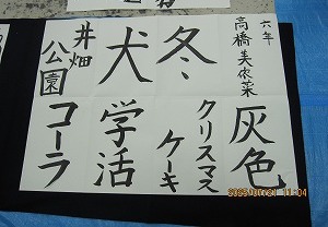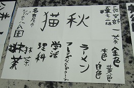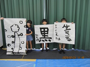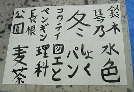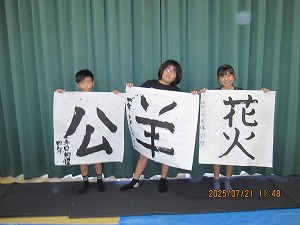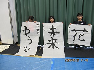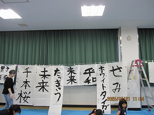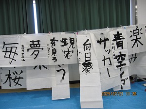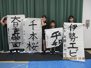 - 今回は自分で好きなことを考えながら書いたので、楽しみながらできる教室だったと考えます。好きなものなどを書き、最後には自分が好きなことを自由に書いてよい、そして今まで普通にはない大きい筆と大きい紙に書き、心に残る思い出となりました。