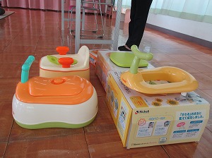 トイレトレーニングを始める時期の目安やあると便利なグッズ、トイレトレーニングのすすめ方をステップごとにお話していただきました。おまるや補助便座、トレーニングパンツ、布パンツ、絵本などの展示もありました。