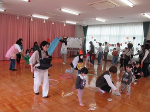 ハロウィーンバージョンということで、コスプレで変身しての参加者がいっぱいでした。パネルシアターや体あそび、リース作りなどいろいろな場面でかわいいおばけと出会いました。おばけサーキットでは、ふわふわトンネルやクモの巣くぐりなど親子で力を合わせて進んで行き、はらぺこおばけにお菓子を届けてあげました。イベント最後には、全員参加型の絵本。パパママの声がこども達にも心地良く、終始楽しい時間を過ごしました。