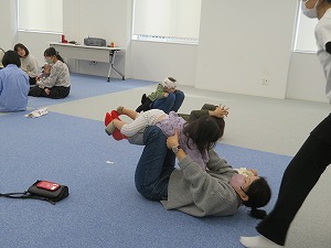 お子さまを抱っこしたり、脚や背中に乗せて、ふれあい遊びをし、最後は簡単なダンスのステップで体を動かしました。