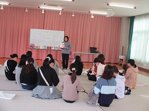 先生のわらべうたから講座が始まり、部屋の空気が一気に変わりました。子育てのお話や絵本紹介があり、先生のわらべうたで講座が終わりました。先生の心地よいわらべうたで寝ている子も数名みえました。